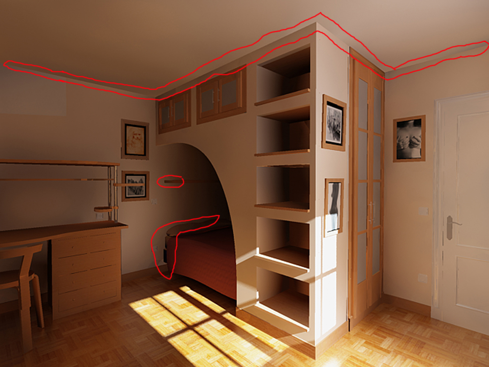 Concuerdo absolutamente con Paula. Aquí te dejo marcado donde le veo algunos gruesos fallos. Lo de más está bien, si no lo puedes arreglar completamente prueba dándole una pasada con el Occlusion de Mental Ray. Saludos.