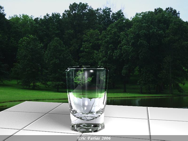 Me gusta el material del cristal, pero el vaso parece cortado por el borde y creo que le falta un poco de antialiasing.
