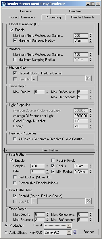 Buenas, adjunto aquí un trabajo renderizado con Mental Ray. Tiene una luz direct fuera de la ventana y un foco en la ventana. Tiene mezclado AO. Adjunto una captura de los valores de GI y FG. La veo con artefactos y poco nítida, la verdad me cuesta bastante controlar el renderizador. Espero consejos. Gracias.