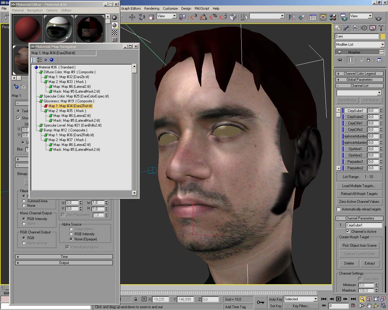 Algunas capturas de pantalla con el editor de materiales y el Morpher. Un saludo.