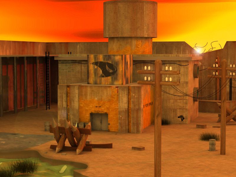 La imagen que envío solamente tiene de postproducción una corrección de los niveles de color realizada en Adobe Photoshop y el pequeño destello que se ve tras el muro que también está hecho con Adobe Photoshop. El resto está tal y como salió del 3dstudio Max 4. Y bueno las texturas de todo me las hice en Adobe Photoshop también. Un saludo, Ferriz.