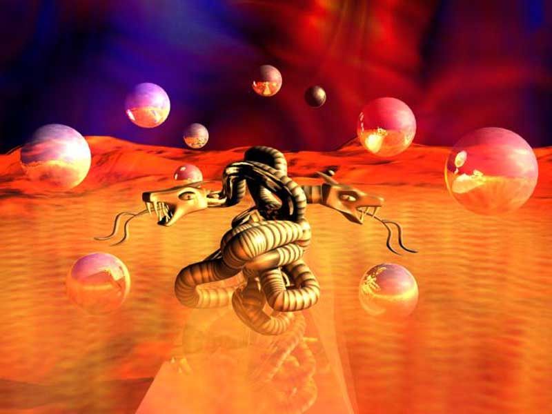 Esta escena la he realizado con 3ds Max 5.0 íntegramente. Todo lo que lleva la escena lo he creado yo, y representa lo que en la mitología nórdica. Se llaman dragones de fuego. Espero que os guste.