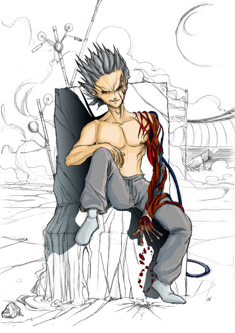 En general yo mandigo el manga excepto en lo que respecta a objetos inexpresivos porque para tecnología son dioses. Como no soy fan del manga no sé si voy a ser redundante, pero a mí me parece un calco de la escena de la película de Akira del chico con poderes que después de que le vuelen un brazo se hace uno biónico con los escombros que había por allí. Como siempre para demostrar poderío ponen el pelo Studio line, o eso o han pedido consejo a yongueras. El dibujo parece escaneado (vamos que parece que lo has hecho a mano) por lo cual un escenario apocalíptico de fondo o bien te lo puedes bajar o bien te lo curras al final en la capa de fondo (no creo que merezca la pena meterle horas al fondo dado que es eso, el fondo. De ese modo puedes concéntrate más en el personaje principal. De tu dominio de la anatomía te doy un 6-7 sobre 10. Casi todos los que dibujamos nos hemos topado con los mismos problemas y las mismas zonas cero, como casi todos se pueden imaginar me refiero a las manos y los pies, porque la cara si te mola el manga es moco de pavo. El caso es que viendo tu dibujo se ve que o bien tienes un don para dibujar las manos o bien has dibujado manos a punta-pala hasta dominarlas, porque la postura de la mano derecha en esa postura es muy jodida, sobresaliente también el antebrazo. Siendo tan sobresaliente la ejecución de la postura de cintura-para-arriba fastidia ver que cuando puedes lucirte (brazo izquierdo) no lo hayas dado todo y hayas querido experimentar con el color (amigo, se puede dibujar de miedo* y ser un patán con el color, te lo dijo por experiencia). Luego de cintura para abajo hay una incoherencia en la posición de la cadera que no acierto a criticar construcivamente, pero en conjunto me parece muy mejorable (desde luego si eres capaz de hacer esas manos eres capaz de todo) y que si bien las piernas no presentan un reto técnico se ve que la zona de los pies están resueltas dignamente.