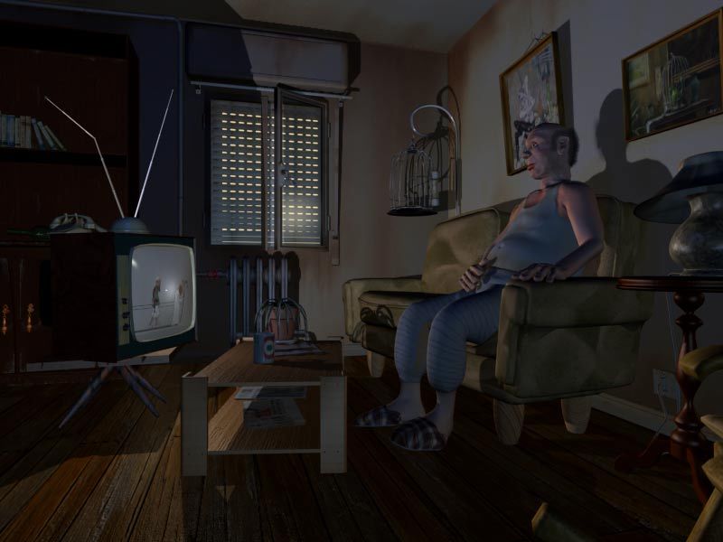 Pues la verdad es que no me había fijado, pero es verdad que no parece que vea la tele, tendrá que corregirlo. También me parece buena idea lo de poner más porquería en la escena, pues sí que era mi intención que pareciera un tío guarro en una casa sucia.