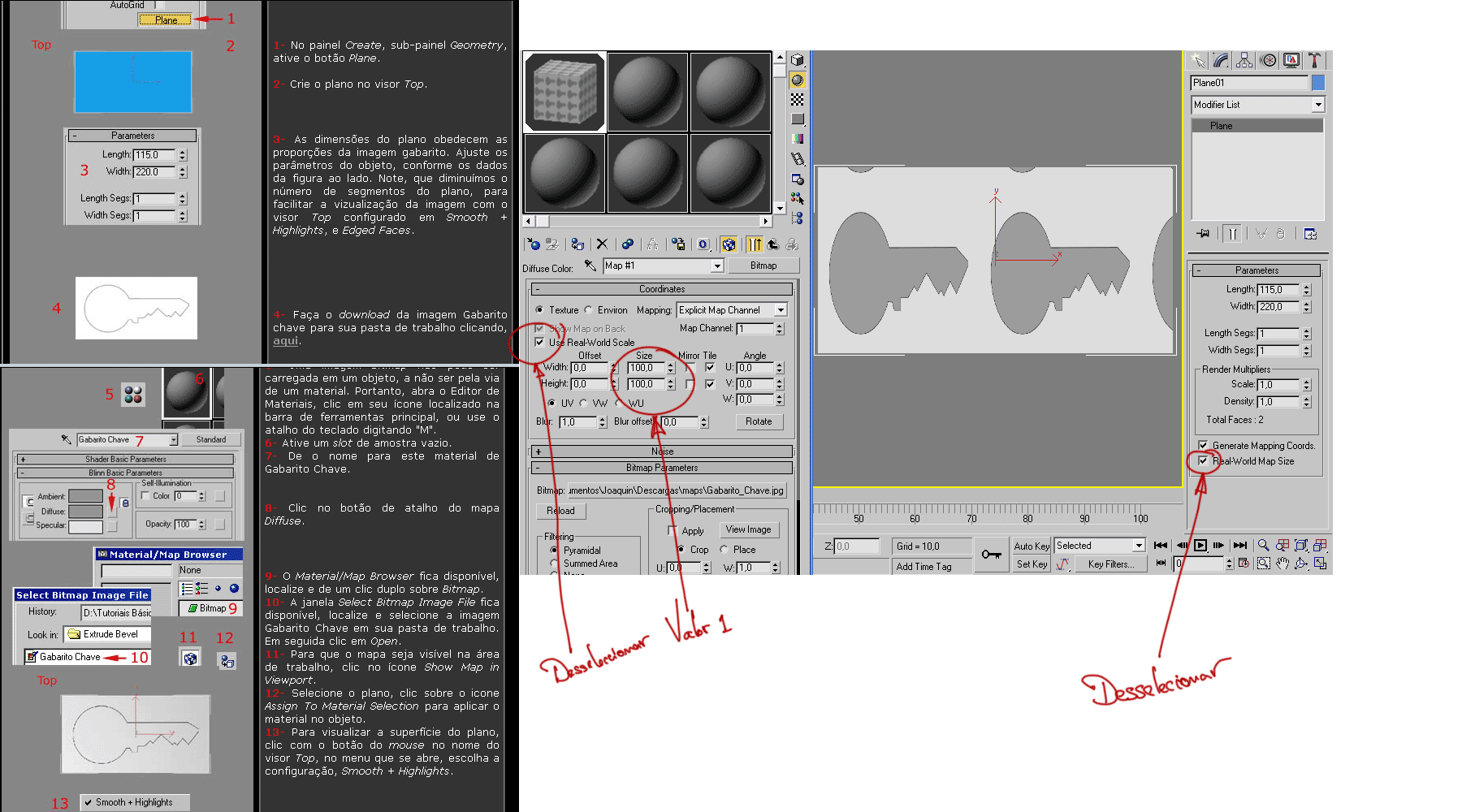 Por último, y también como pista te sugiero que observes los resultados obtenidos con distintos valores y como estos afectan al display gráfico tanto en los visores de 3ds Max como en el visor de materiales. tip: intenta sacar conclusiones entre los resultados y los valores tipeados tanto en las medidas del plano como en los introducidos en el visor de materiales en el contador size. Saludos.