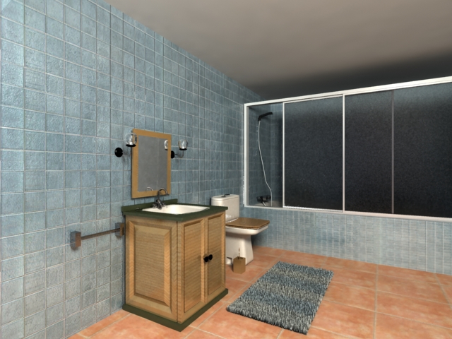 Vaya, trabajo vendiendo estas cosas que si mamparas, que si muebles y espejos, en verano era vendedor de cerámica, así que, puedo decirte que todo lo referente a eso está bien. Lo que más me falla es la alfombra, no sé, le veo la textura rara. El techo tampoco parece muy acertado. Lo que más me ha molado ha sido la cerámica de la pared y la textura de la mampara, aún que está última la haría menos opaca, yo aún no he visto ninguna tan oscura.