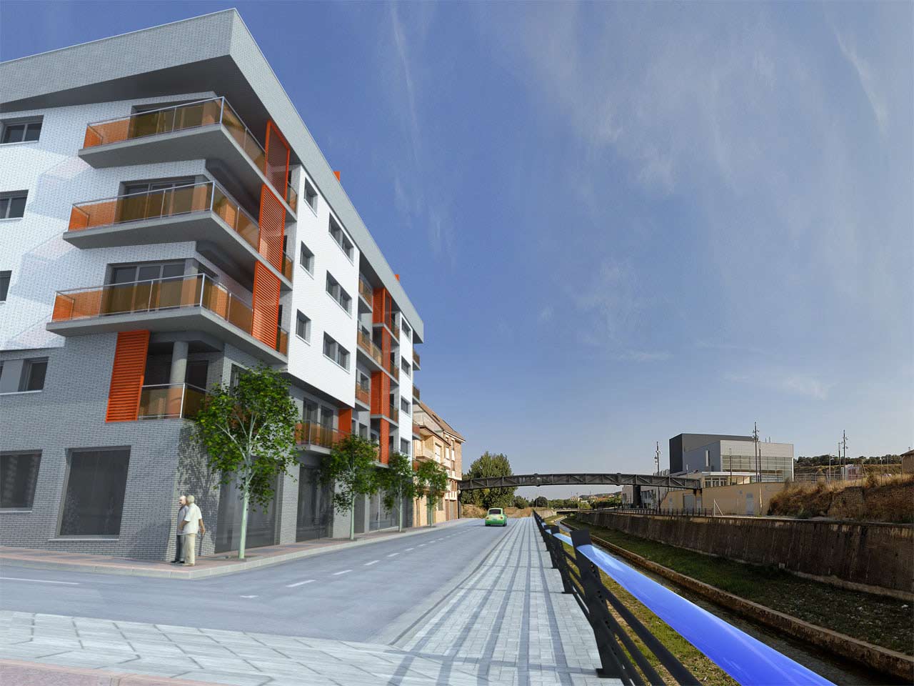 Guarfreim: la imagen final esta cortada por abajo, por que la calle continua, no sé por qué he puesto una versión previa, lo siento, lo de la cámara forzada esta echo así a propósito, por que el puente que se ve, es nuevo y lleva al palacio de congresos que también es nuevo, y para que se viera todo pues se tuvo que hacer una fotografía gran angular que deformaba la perspectiva.