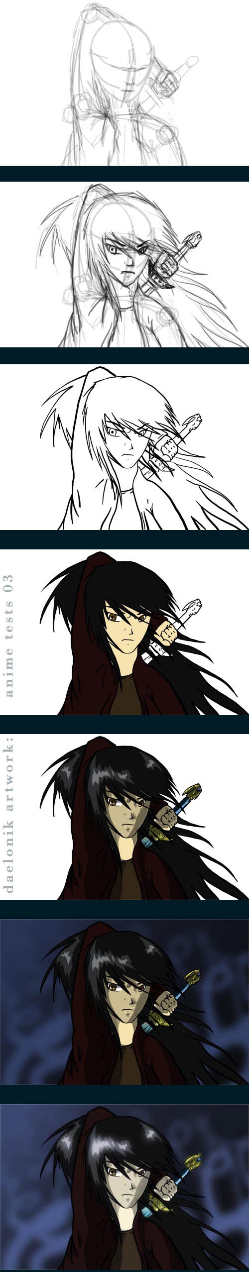 vaya si que aprendes rápido Daelon estilo manga, mu buena la imagen, lo que me contrasta en la línea de dibujo del personaje comparada con el fondo, pero vaya muy buena imagen, y encima con el proceso, detalle, muy bien, así aprendemos todos. Saludos.