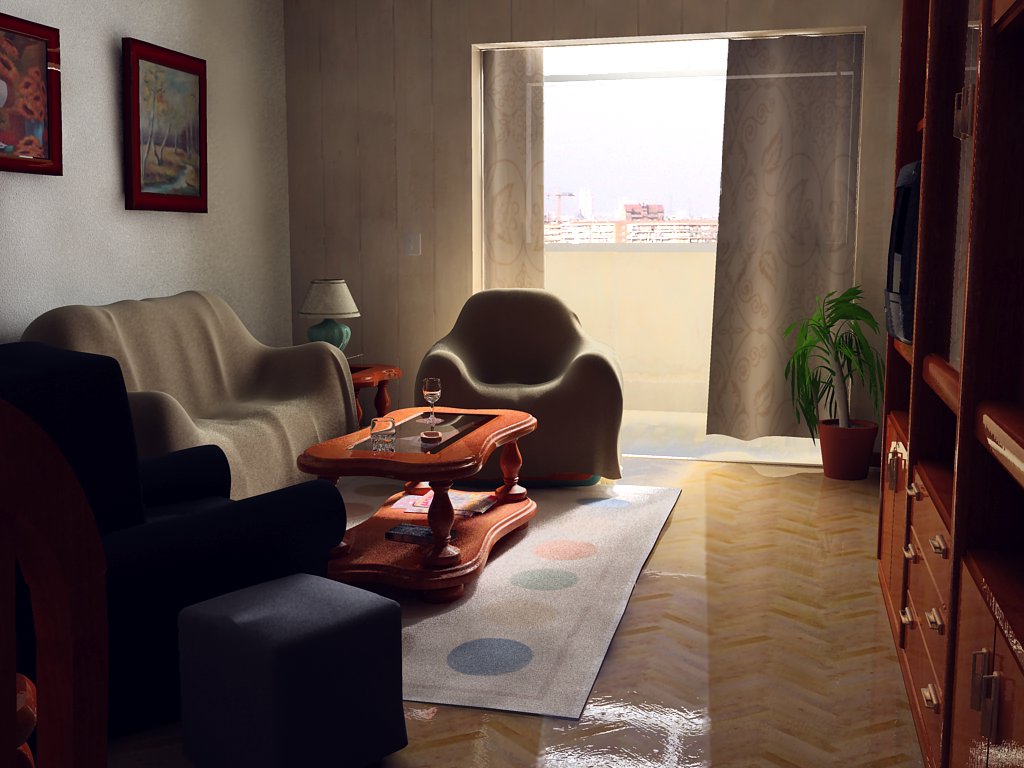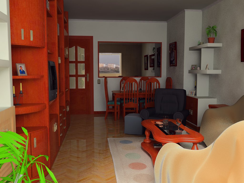 Mola. Está chulo para ser el primer Vray. Yo hice un churro. Y sé lo que emociona cuando ves algo tan parecido a lo que conoces. La escena la veo poco oscura. Te digo lo que yo haría: subiría un poco la luz del sol, y si tienes una Vray en la terraza, le subiría las subdivisiones de esta (las tendrás a 8, yo las subiría a 15 o 1 eso hace que la luz de la Vray llegue a los rincones mejor y no haga esas manchas negras en la pared. Tardará un poco más el render. Lo demás, retoques en Adobe Photoshop. El suelo tal vez tiene demasiada reflexión (o tu madre se pasa con la cera) un saludo.