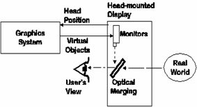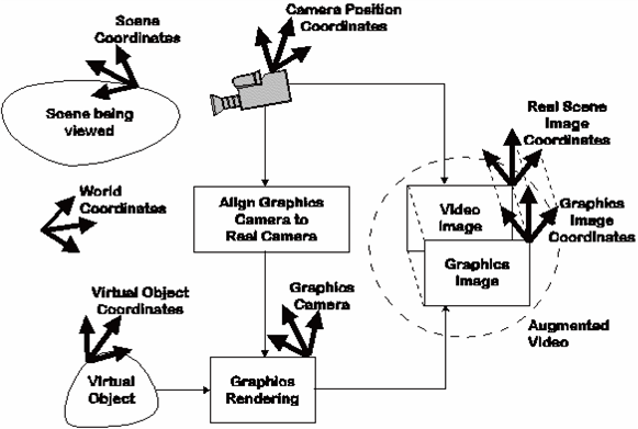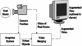 Podrías usar un HMD (head mounted display) que a la vez que emite coordenadas de posición (y dirección de la mirada) al procesador gráfico 3d recibe el render en tiempo real mezclándolo bien con la visión real (mediante lentes especiales) o bien con vídeo sacado desde el HMD, conseguir un tracking perfecto y disminuir el delay en las transmisiones son algunos de los problemas a los que se enfrentan estos monstruos mediante algoritmos de aúpa, un par de esquemas más y una fotografía de cómo están las cosas si hablamos de Mars.