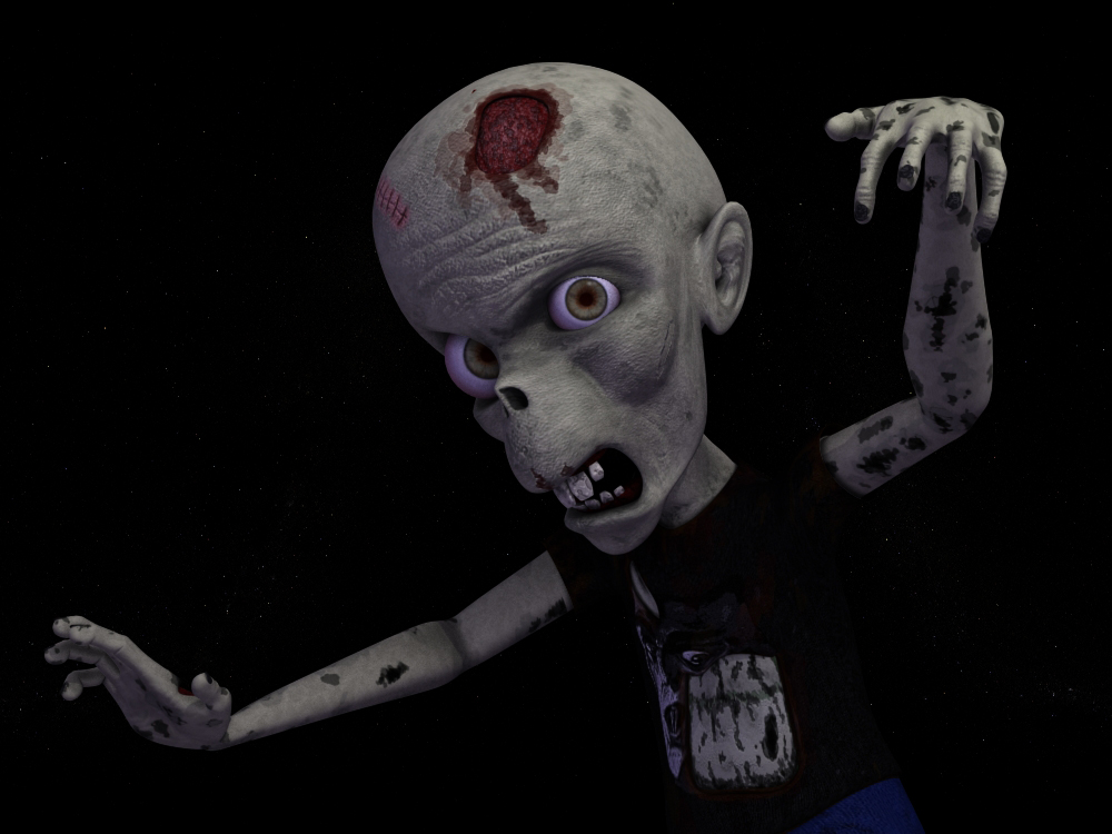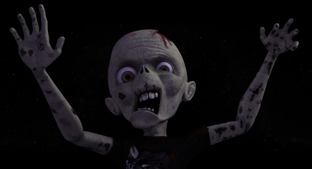 Muy interesante. Lo único la iluminación, es muy plana, coloca alguna luz en un lateral y un poco más fuerte para que cree más volumen al zombie. Le dará más vida a la imagen.