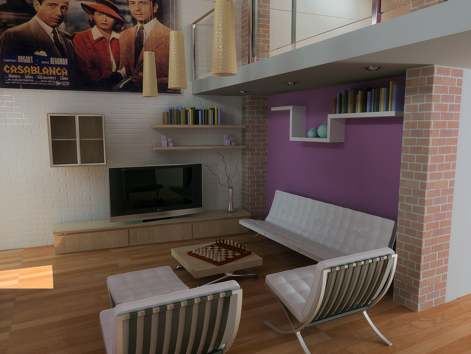 Hola a todos, gracias por contestar, Franhegar el televisor tiene un pie muy fino, por eso se ve tan poco espesor en la base, con respecto a la decoración tienes razón, faltan cosas, fue mi primer render de algo que seria fiel a la obra que después realizo mi amigo para su piso. La tiras de la silla Barcelona van en ese color, aunque en blanco no quedarían nada mal.