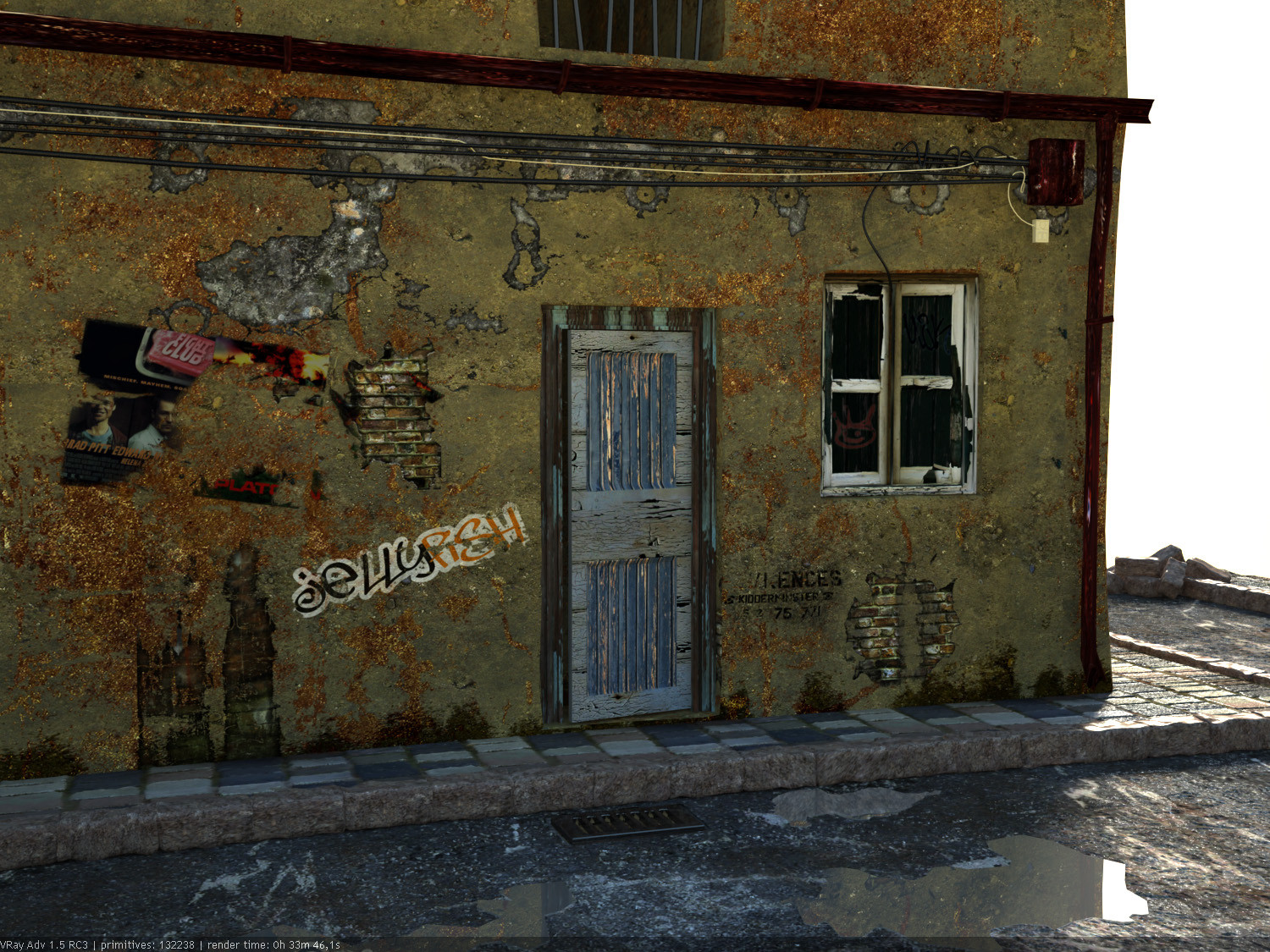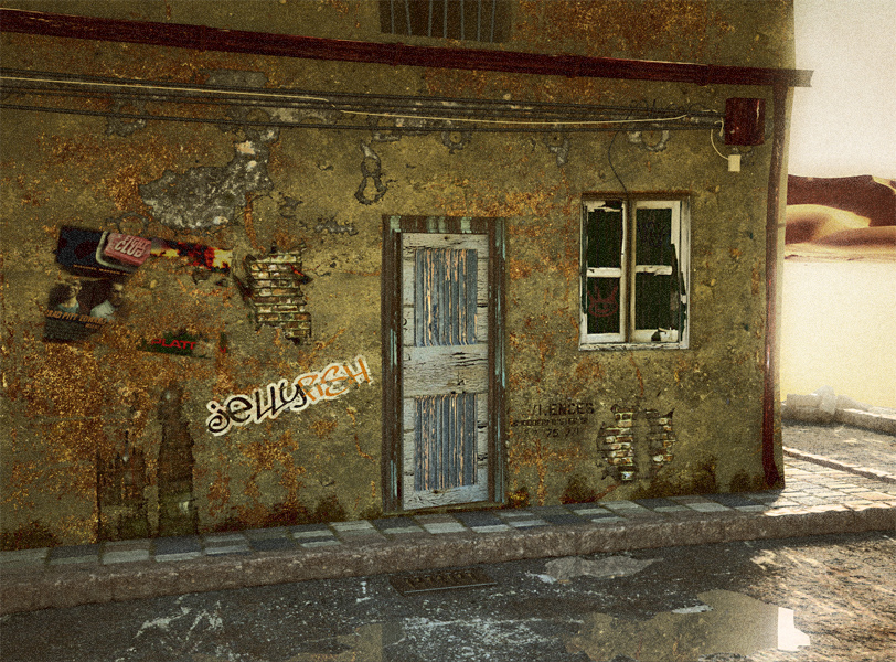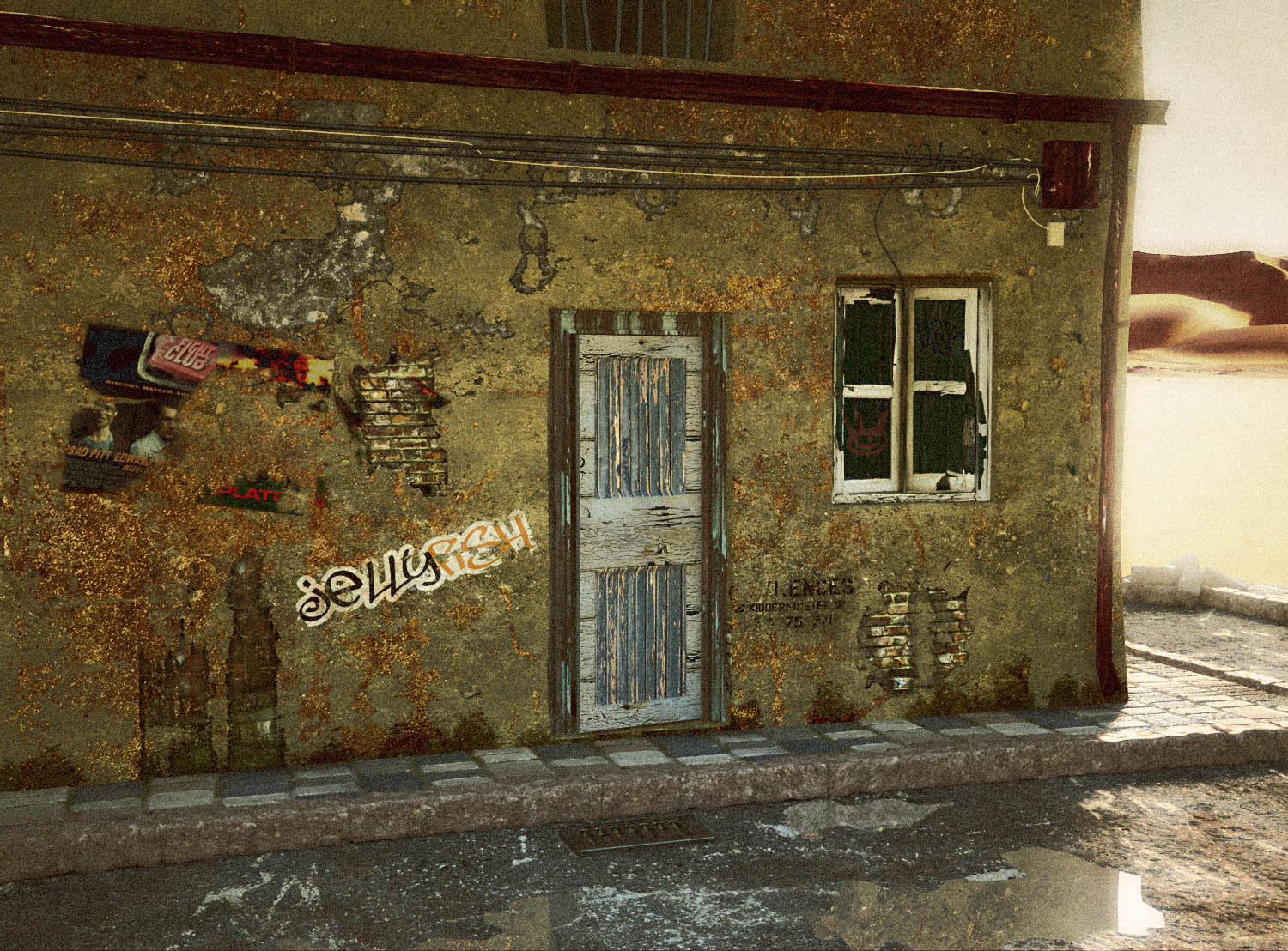 Hola, yo también veo el grafiti raro demasiado no sé si limpio resalta demasiado y parece pegado, el desierto lo único que veo raro que parece que es de día y en la imagen de la casa es más atardecer no me concuerdan las iluminaciones, me gusta mucho la textura de la fachada y la acera y la calle son también de postproducción?