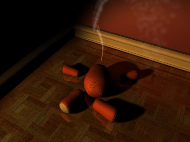 Intenta ponerle una textura de pelo más realista, con el Shag-hair, por ejemplo. Además, yo desgastaría un poco el parqué, le quitará algo de reflejo, ensuciara un poco más el peluche y lo despelucharía un poco. Creo que de esta forma lograras una imagen más realista.