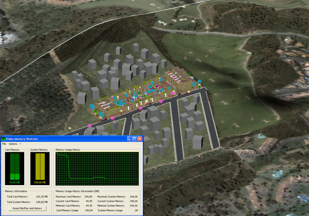De todas formas. Es una escena con 80 viviendas de por medio. Piscinas, un terreno de varios kilómetros cuadrados con mega-texturas de miles de píxeles. Y todo visible. Y sobre todo con la OpenGL del 3ds Max a todo lo que da (1024 en tamaño de texturas).
