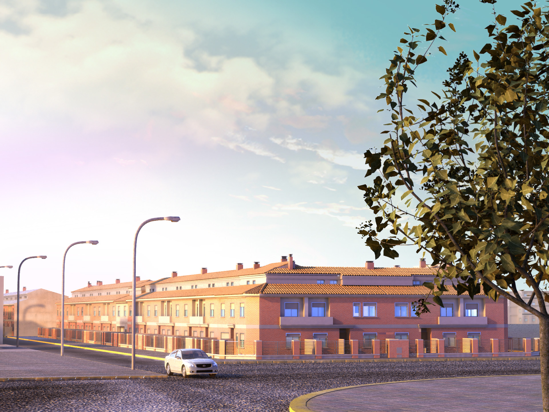 Mira creo que tienes algo de problemas con las texturas y la composición de la imagen en general, le diste demasiado énfasis al árbol, con eso descuidaste lo esencial que era mostrar el conjunto de casas, la textura del piso de verdad no le viene para nada, esta.cr4eo con demasiado Bump, el color del render me gusta, le viene con el cielo, pero pon ojo en como compones la escena, se ve que trabajaste en el modelo así que, puedes lograr algo mejor. Saludos.