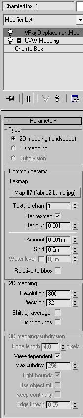 Un material Vray, en el material difuso pongo la textura normal, por ejemplo, una de madera, en Bump pongo una en escala de grises, aplico al objeto texturizado un UVW mapping box, luego aplico Vray displacement mod, de la siguiente forma.