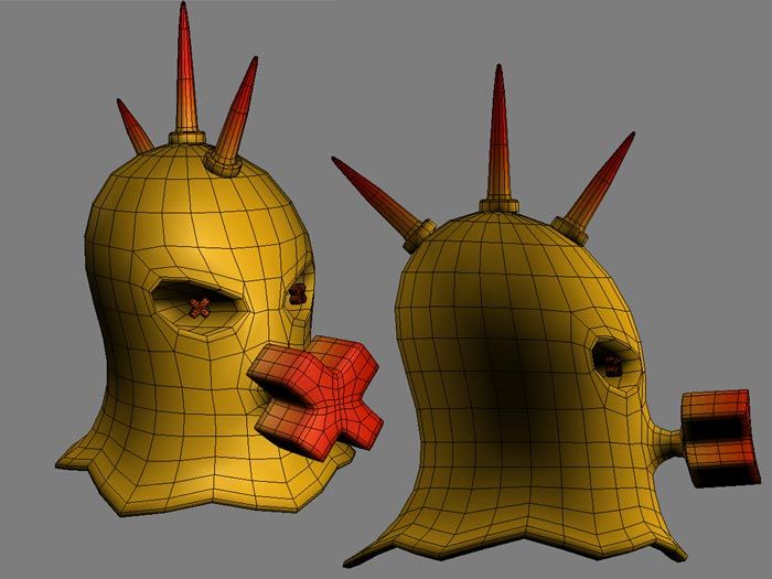Gracias gente, por las opiniones y por el ánimo. Bueno, he aquí la malla con un par de iteraciones de MeshSmooth menos que el render. Como se ve, me basé en una esfera con pocos polígonos, y cómo se ve, las puntas de la cabeza están modeladas aparte y simplemente superpuestas de todas formas, tenía una forma menos graciosa y grotesca hasta que le puse un FD 4x4x4 y lo deformo un poco (triquiñuela de principiante, otra vez.