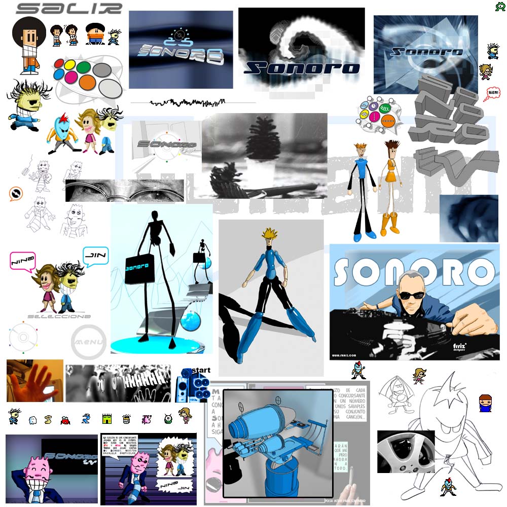 Por cierto, aunque muchos piensan lo contrario, los gráficos de sonoro no son lo primero que nos salió, si no que estuvimos investigando bastante para conseguir un aspecto diferente. Os coloco una imagen que muestra algunos de los bocetos y pruebas que realizamos en su momento.