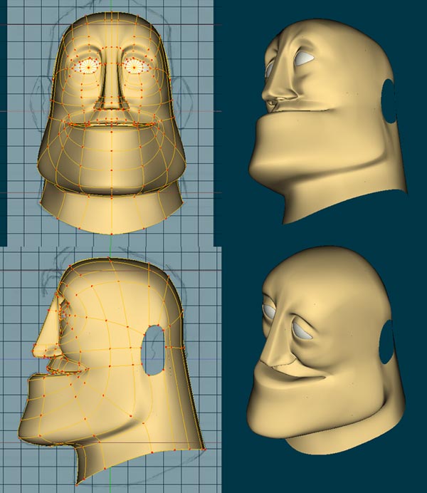 Como a fin de cuentas, el personaje es redondo, he decidido rehacerlo de cero para empezar de una esfera (segunda imagen), y la verdad es que el resultado ha sido mucho más limpio. Además, he añadido párpados, con dos medías esferas con el borde un poco extrusionado hacia dentro.