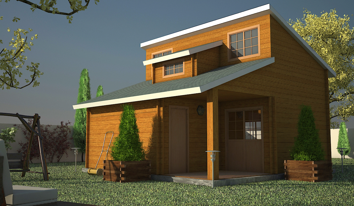 Buenas a todos de nuevo. Publico una cosa que he me encargó un amigo que vende este tipo de construcciones. Tuve que hacerlo en dos días, 16h y teniendo en cuenta que casi tuve que hacerla a ojo, no me dió medidas en planta, solo en alzado. En fin, solo falta definir las texturas del tejado y de la madera del bungalow, ya que, como seguro habrá que cambiar eso, no me las he trabajado nada. Aunque se quedará así, sin más objetos ni más diseño que ese.
