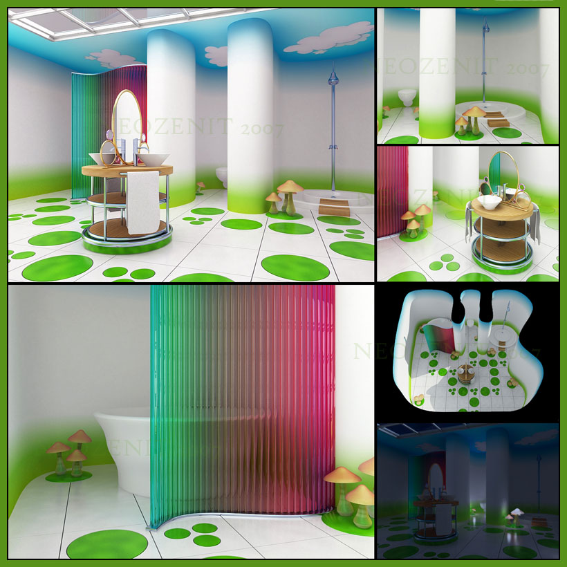 Si señor, muy buenas las imágenes, el diseño mola un mazo, hay que ponerse en la cabeza de un niño y yo como aún la tengo me dice que les mola a todos los niños, aunque sólo unos cuantos años, en cuanto le venga la regla a la niña puede que cambie de opinión y prefiera el set de la Barbie. En cuanto al diseño, yo le pondría esa manpára tan chula rodeando la pared de la ducha, primero para dar una especie de simetría y a la vez proteger del agua la pared. Luego creo que necesita un poco más de vida en el fondo y lateral (que no se ve), quizás con esos mismas setas, pero enormes que, sirvan de espejo corporal, colgador, cajones para toallas, ya se me ha ido la pinza ves.
