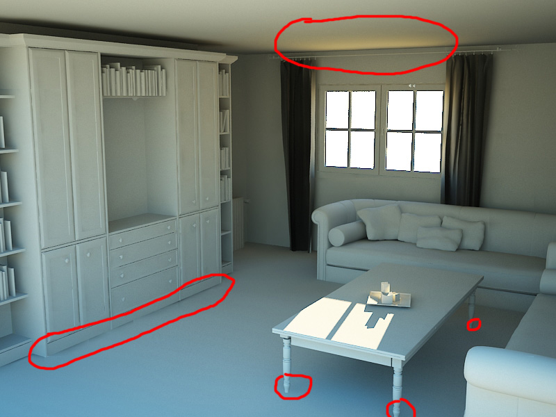 Hola, esta es la primera vez que utilizo Vray y me estoy guiando por algunos tutoriales, os voy a mostrr la imagen y marcaros en rojo los errores que no sé por qué se producen, y la verdad que agradecería la ayuda que me podáis dar para mejorar el render, muchas gracias.