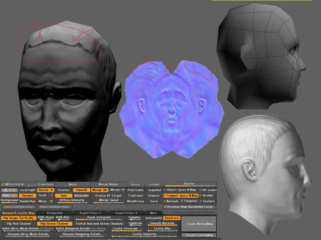 Utilicé el ZMapper, cargué una configuración para Max 7 y probé con las opciones de "Objectspace" y "Tangent_space", pero obtuve el mismo resultado.
