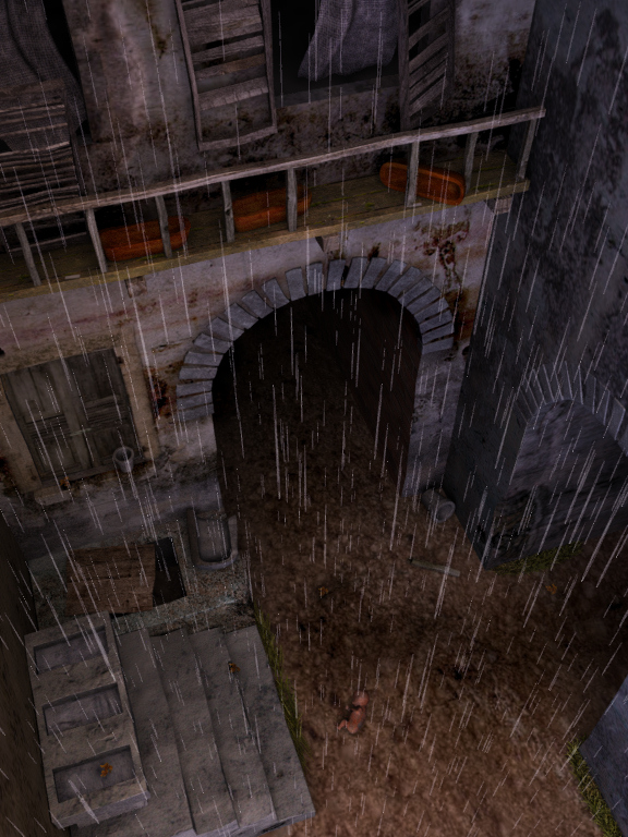 Se agradece una imagen menos convencional. Aparte de lo que ha comentado muy acertadamente Necromancer, el suelo debería estar mucho más encharcado (quizá con algún que otro charco grande y varios pequeñitos, reflejando difusamente -por el ruido de las gotas que caen sobre el y las ondas provocadas- Parte del edificio y el cielo encapotado), aparte de darle un canal especular y de reflexión a los materiales para simular mejor su humedad.