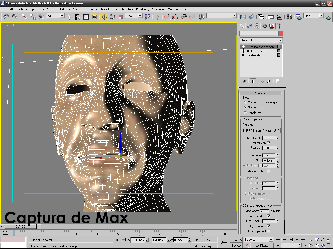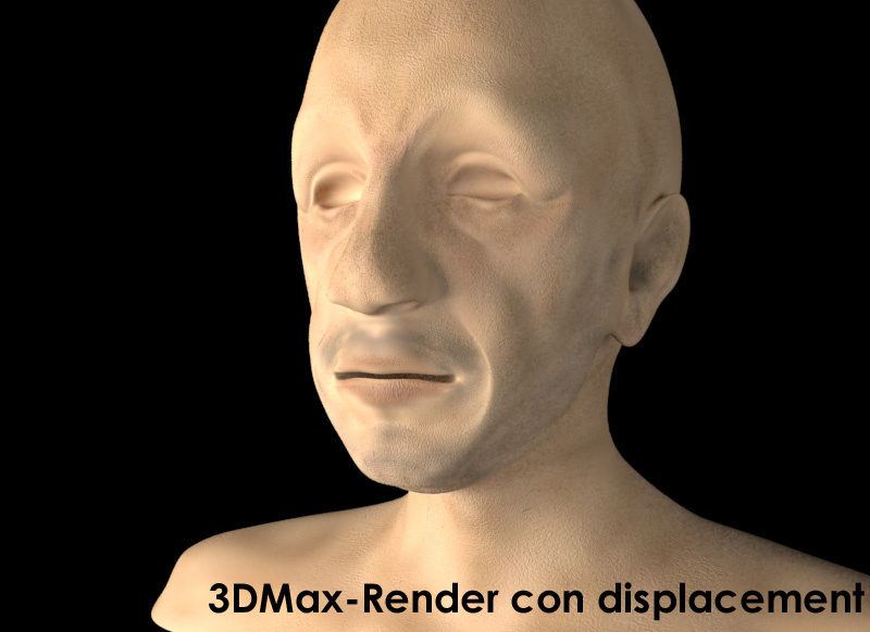En max lo importo, le aplico un MeshSmooth con dos subdivisiones y luego Vray displacement mod. En el texmap meto el displacement (antes le he aumentado el contraste el Adobe Photoshop, y también hay que girarlo verticalmente). Probando encuentro que los parámetros más o menos buenos son amount= 0,6 y shift=-0,3 (la regla es dividir por -2 el amount para obtener el shift).