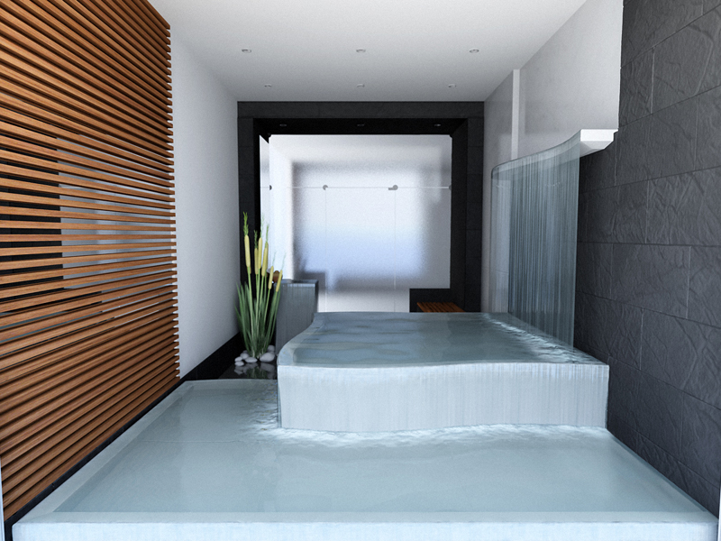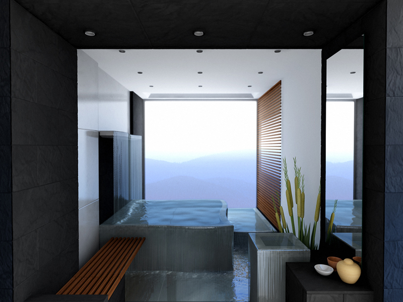 Está bien, es muy elegante. La verdad es que es difícil conseguir el efecto de agua cayendo. Mejoraría la imagen poniendo un brillo Glossy a la piedra negra, y a la madera.