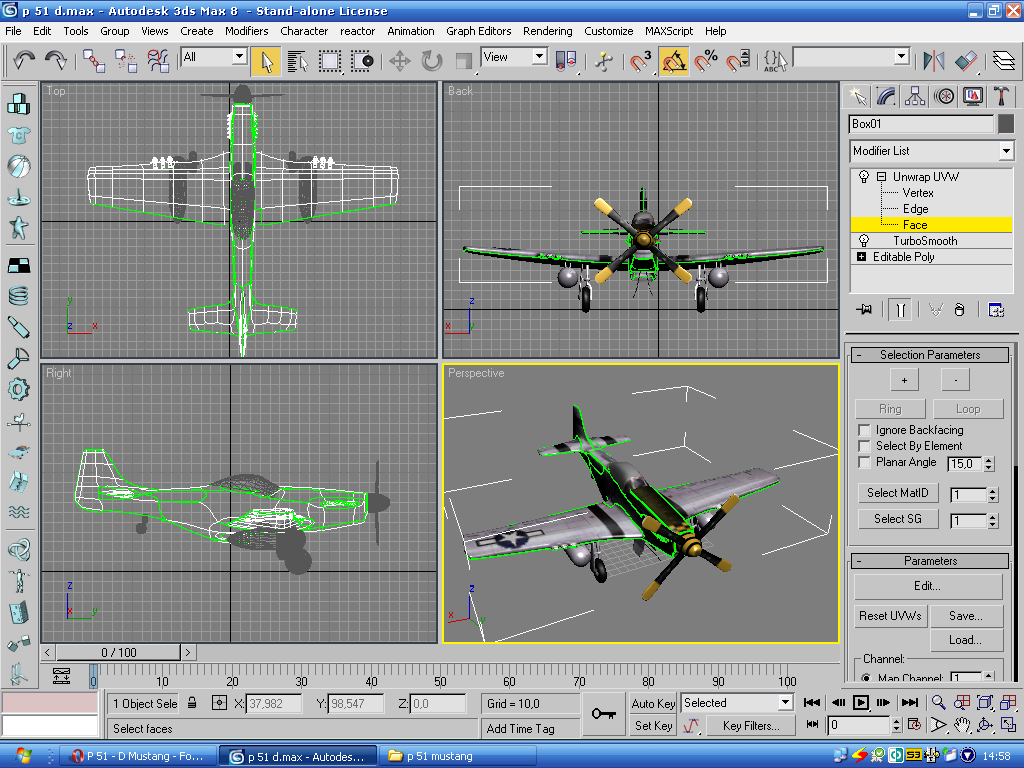 Hola, hola, hola, como andan, bueno, estoy haciendo mi primer avión, y me decidí por un clásico el Mustang, tengo problemas con las texturas, pero mi mayor inconveniente lo encuentro al momento de darle render (con Scanline), no me renderea las texturas correctamente como yo las coloque, no sé, pero ya le voy a encontrar la vuelta, por ahora les dejo esta pésima captura de pantalla. Un saludo.