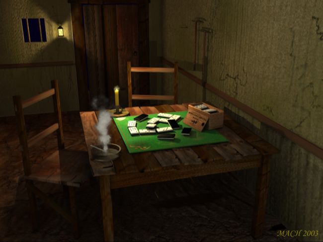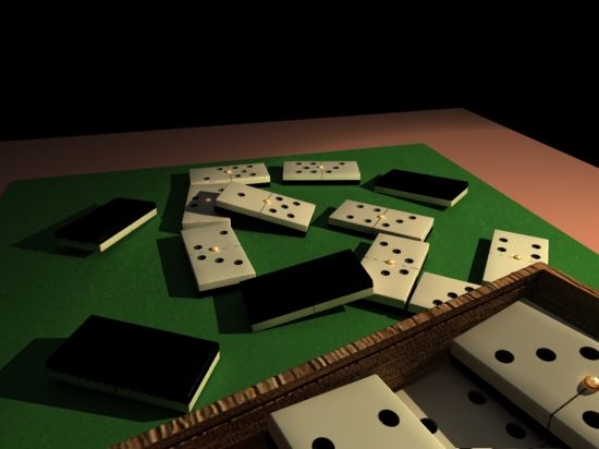 La escena está muy bien (sobre todo esa vela está perfecta) pero a menos que quieras hacer un anuncio de dominós, creo que te falta darle una historia a esa escena. Así tal y cómo está no dice nada (al menos a mí). ¿hay algo que contar?