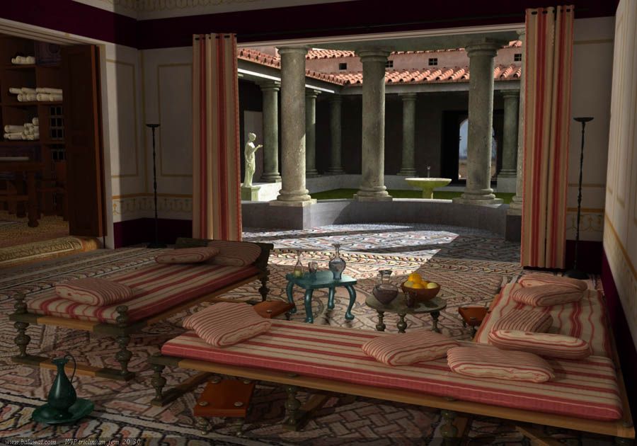 De que es complicado iluminar una escena así, te lo aseguro, me estoy dando de tortas con el render. Si ilumino por un lado, se quema por el otro. Si bajo de intensidad, otro sitio se queda a oscuras. Solución: además de GI, omnis por partes de la escena. Incluyendo y excluyendo, dando toques tanto de intensidad, color, tamaños atenuación, colocación, vamos una verdadera locura, que añadido al elevado tiempo de render hace imposible al contemplar la escena que todo esté como lo habías planeado. En definitiva, he borrado y empezado de nuevo. (las luces, claro está) y he puesto un direccional de luz principal (he probado con otras, y no sé, me ha convencido está), después he colocado un omni en la biblioteca, otro a la entrada del triclinio y otro en el sentido contrario de la entrada del triclinio simulando la luz de una ventana (todas ellas con atenuaciones cercanas y lejanas) pues bien, una vez renderizada, me doy cuenta que los elementos mobiliarios quedan muy matados, muy planos (debido a que el efecto tridimensional más potente se produce cuando la luz incide sobre el objeto directamente, no en sombra), así que le pongo otras dos luces en cada lado de la habitación en el mismo ángulo que las otras dos interiores pero estas solo incluyen el mobiliario.