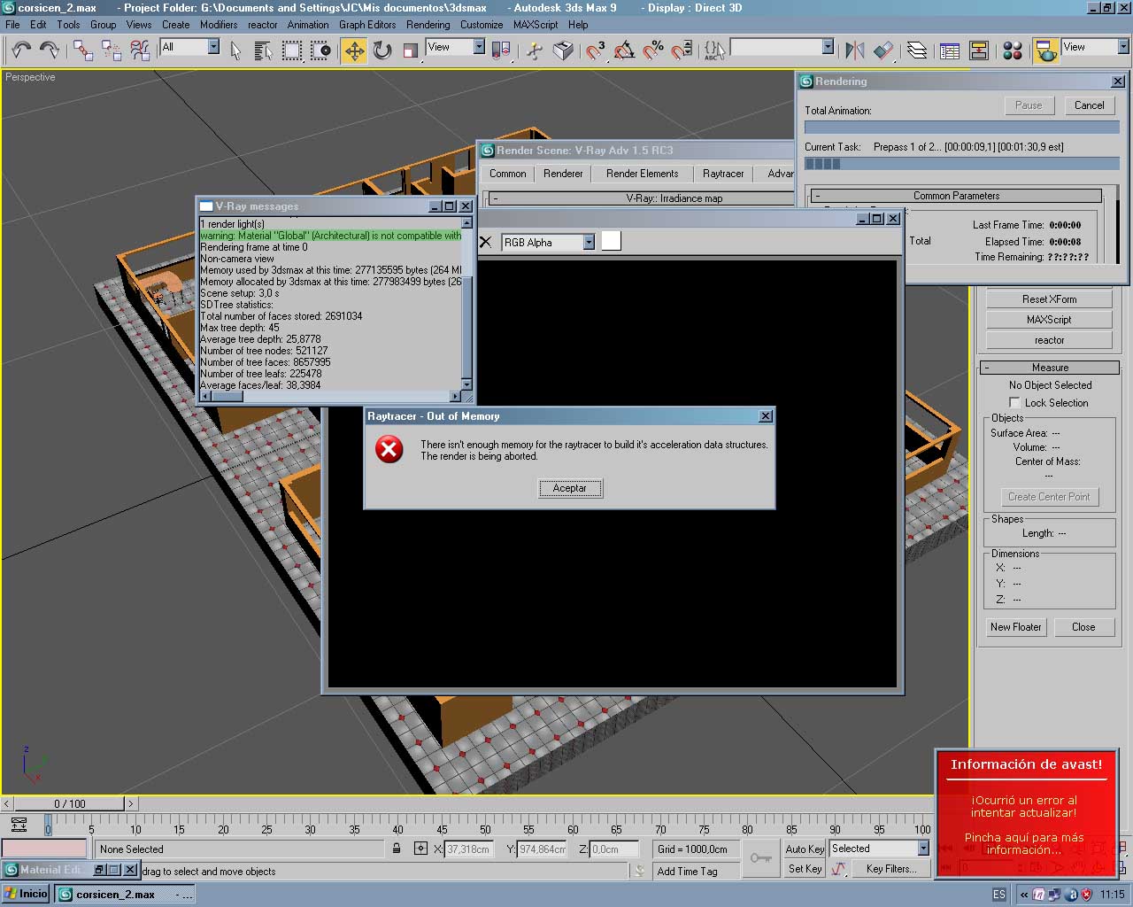 Bueno, estoy tratando de renderizar un trabajo y me aparece este error. Tendré que resolver el problema o me quedaré sin dinero. Todo estaba funcionando bien, tengo un Quad y 4 GB de RAM. Me la compré para ser más rápido (y realmente lo es), pero no sé de dónde viene este error y no sé a qué se debe. Si alguien lo sabe, gracias de antemano.