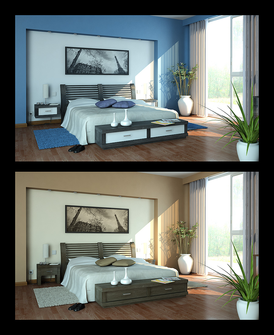 Me quedo con la azul, porque la marrón me parece muy marrón, vamos que no tiene mucha variedad de color entre la pared y la madera del suelo, y yo creo que una habitación real con ese color terminaría aburriendo. Por otro lado, reconozco que el azul de la imagen es bastante fuerte y quizás a la larga (aunque por otro motivo) terminaría cansando igual. Lo ideal sería que pudieras sacar un render con un azul más suave, más pastel, aun así, sigo prefiriendo el azul porque entra mucho más por los ojos que la otra, quizás debido en parte a que la madera del suelo tiene un tono ligeramente anaranjado lo que complementa muy bien con el azul de la pared, y por ello tiene mucha más variedad cromática que la imagen marrón, lo de combinar los elementos de ambas imágenes me refería sobre todo a las alfombras, ya que las azules son un poco llamativas, por lo que elegiría la pared azul (si pudiera ser más claro mejor), los muebles de la imagen azul, pero las alfombras de la otra imagen (e incluso probaría con los cojines también).