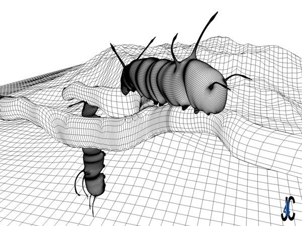 El gusano está en una rama que se supone más elevada del suelo, pero entre que todo es blanco y que, todo hay que decirlo, el suelo tiene una forma confusa, da la sensación que no hay distancia entre la rama y este último, ya que el gusano es el prota de la escena, yo enfocaría la cámara hacia el y la rama y desenfocaría el suelo y el fondo (un poco) y así conseguirías separar ambos planos, dar mayor profundidad a la escena y ayudar al observador a comprenderla, ya que, cuando la ves por primera vez, tardas un poco en situarte.