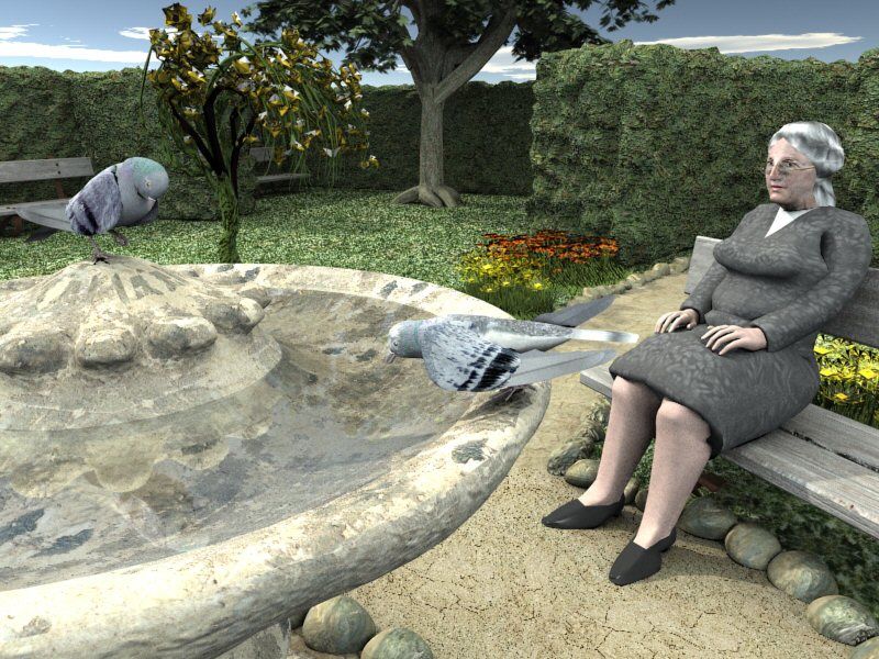 Carpetano, echaremos un vistazo a eso que comentas sobre el agua, gracias. El render se hizo en 3ds Max, los únicos modelos de esa escena creados en Poser son las palomas, la anciana es un modelo antiguo de viewpoint retocado.