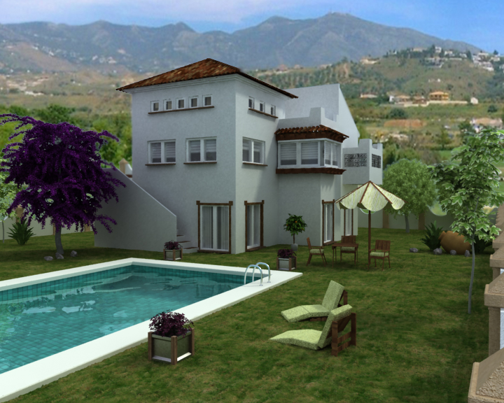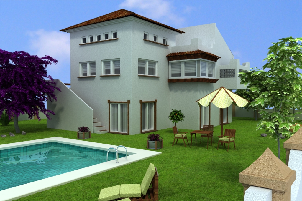 Hola. Está muy bien la imagen, aunque quizá demasiado saturada. La textura de las tejas deberías trabajarla más. La tumbona parece fuera de escala, como de juguete. El agua de la piscina no me convence del todo y el césped debería ser algo más irregular.