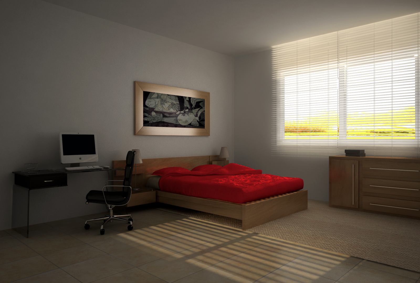 La veo muy bien, pero el exterior esta quemado, y veo la habitación un poco vacía, como si fuera de hotel y no viviera nadie, impersonal vamos, sobre todo lo del Picasso, pero es cuestión de gustos. La iluminación la veo bien, quizá un poco oscura, no se aprecian bien los objetos que hay sobre la mesa de ordenador, pero quizá era ese el efecto que querías dar.