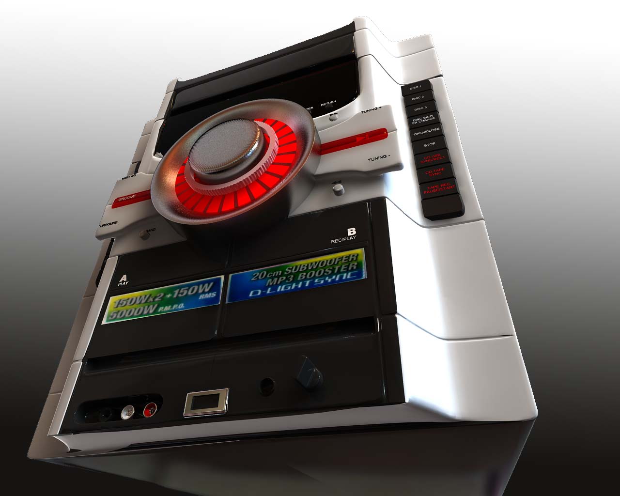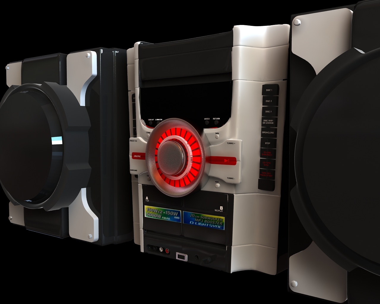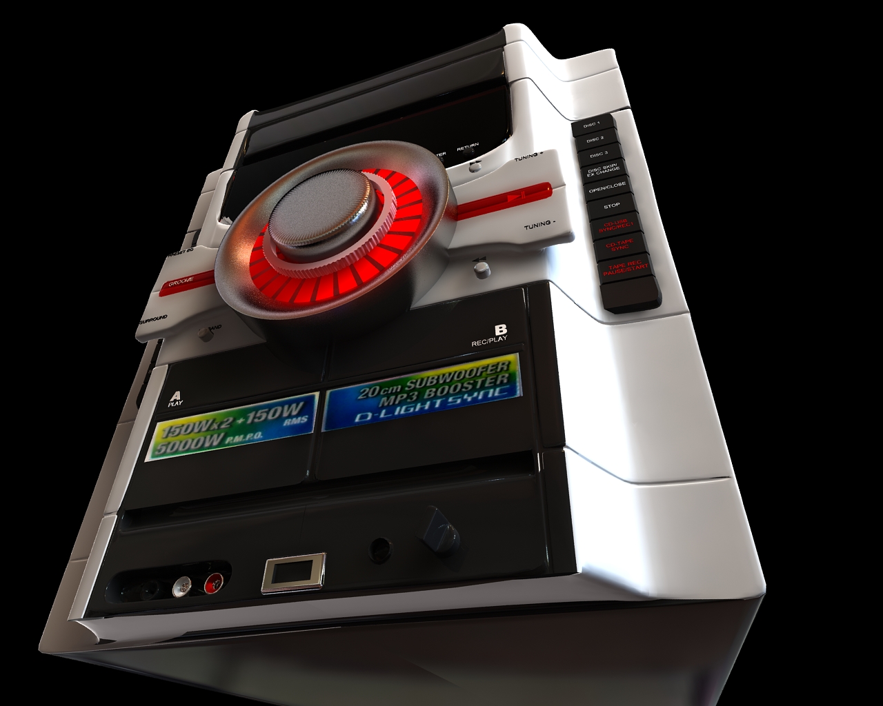 Está muy bien modelado, pero yo miraría el botón de rebobinar de la primera imagen parece que está flotando, también la parte inferior hay una sombra un poco rara, que te hace una línea recta, y una cosa más, los altavoces tienen ese material tan brillante? Parece muy brillante, no sé qué tipo de material será. Un saludo.