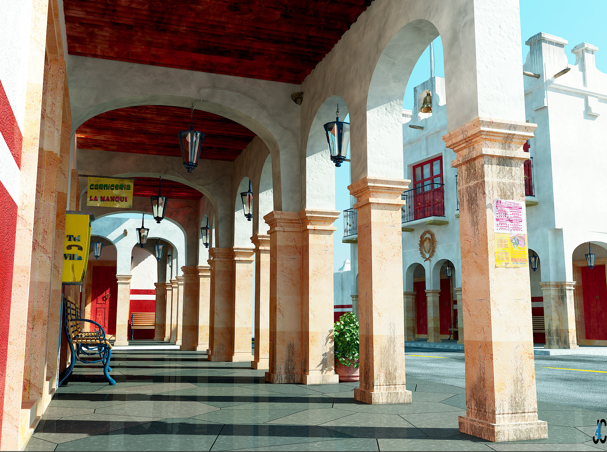 Cierto, demasiada reflexión el suelo, y el nido de golondrina parece un pegote, está raro ahí puesto, le faltan sombras o algo que haga que parezca que realmente está ahí, y el cartel de la columna esta pixelado, el techo también lo veo pixelado, puede ser por la calidad de la fotografía, no sé. Y el cristal del farol lo pondría más envejecido, por lo demás me gusta, está muy bien. Saludos.