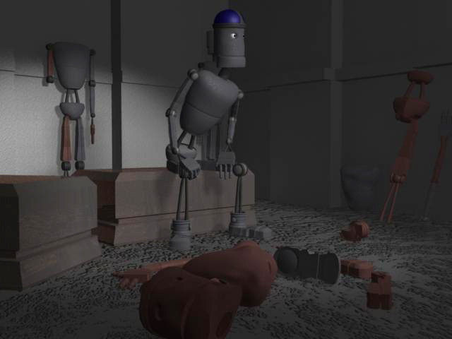 He hecho una escena con bot-it se trata de un almacén donde guardan robots viejos y desguazados y el se encarga del mantenimiento del almacén a su vez ve que tarde o temprano acabara como los demás robots oxidados y rotos. No me excedo más os dejo la imagen, está hecho en Maya y renderizdo con Mental Ray. Un saludo.