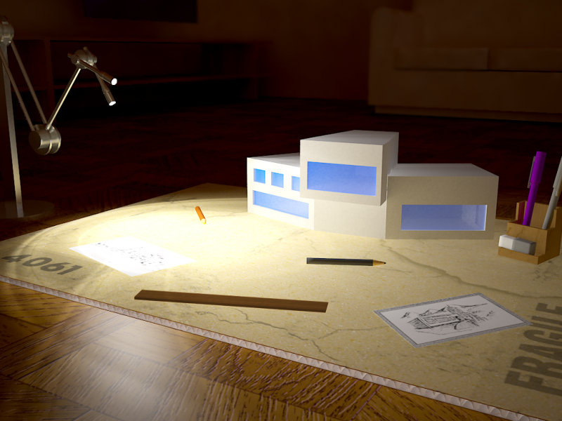 Hola a todos bueno aquí estoy haciendo una escena. Para regalarsela a un amigo que va a estudiar ingeniería, en construcción fuera de la ciudad donde vivimos, la idea es que se note que es muy tarde y está terminada la maqueta, es como para que vea que lo que viene no es fácil, no sé si entienden? Quiero que me aconsejen si está bien la iluminación si le pondrían algo o sacarían algo.texturas y esas cosas.