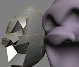 Esta forma de trabajar nos ayudará a perfilar el objeto de una manera clara y sencilla, pudiendo añadir el nivel de detalle que queramos imprimirle al modelo. Aquí hemos hecho una boca y unas cuencas oculares seleccionando los polígonos y extruyéndolos (Control +d) en y local para crear las depresiones perpendiculares a la cara. Para la nariz haremos lo mismo que hemos hecho para los ojos y la boca, pero al contrario, de manera que, sobresalga prominentemente. (en el modelo subdividido adquirirá una forma algo más comedida).