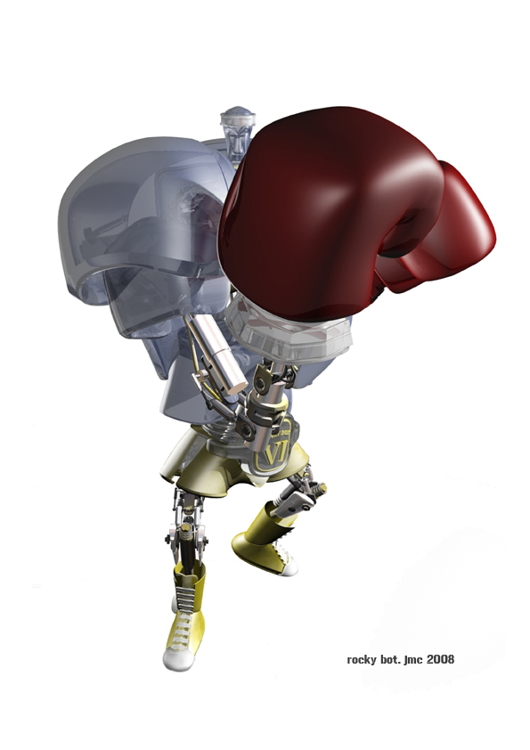 Me gusta, es original y tiene un buen acabado. Con una iluminación más elaborada ganaría enteros, aun así, hasta que no vi la animación no comprendí del todo la forma del robot, creo que la imagen es un poco confusa en eso. Podría quedar bien dando un gancho de derecha, con el puño en primer plano y el resto del cuerpo en escorzo, ya que de esta manera tendría movimiento la imagen y, además se vería mejor el resto del cuerpo (en la que pusiste tú los guantes tapan demasiado).