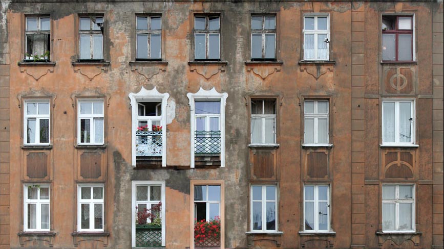 Supón que una ventana de las pequeñas mide x, usa esa x como unidad de medida i mira cuantas x mide el edificio en alto y ancho, crea un plano en vista frontal con las mismas x de anchura y altura, dibuja encima son Splines y modificador extruir. Un saludo.
