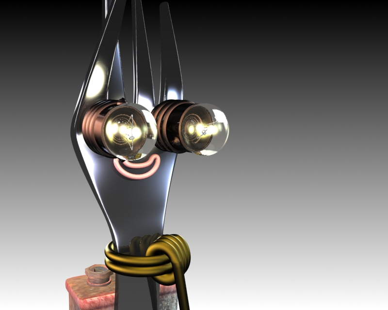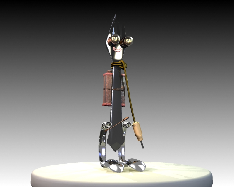 Respecto al robot, pues hombre, es un tenedor con una pila, dos luces y dos cucharás el problema de hacer estos personajes simpáticos depende del profesor. Tu modelo no está mal, así en principio, y parece bien modelado, pero no es un personaje al 100%, no da los problemas que da un personaje completo como otros robots que por aquí se han visto. Por eso depende de que valore más el profesor.