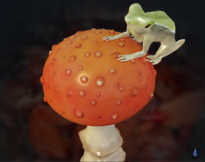 Realmente parece un buen trabajo de iluminación y texturizado, pero el modelado de la rana desentona bastante. Saludos.