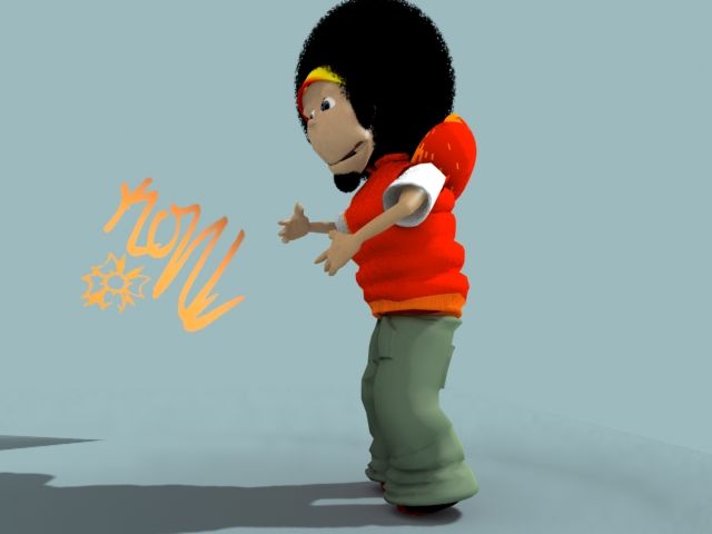$ recordad, chicos. Ante todo, no le pidamos fotografía, ¿ok? El personaje está gracioso. Tal vez un color más oscuro de piel no le iría mal. La solución que has dado para el pelo, fuego negro, es tan curioso como resultón. ¿dónde te iniciaste en el 3d -lo digo por lo del curso? Saludos.